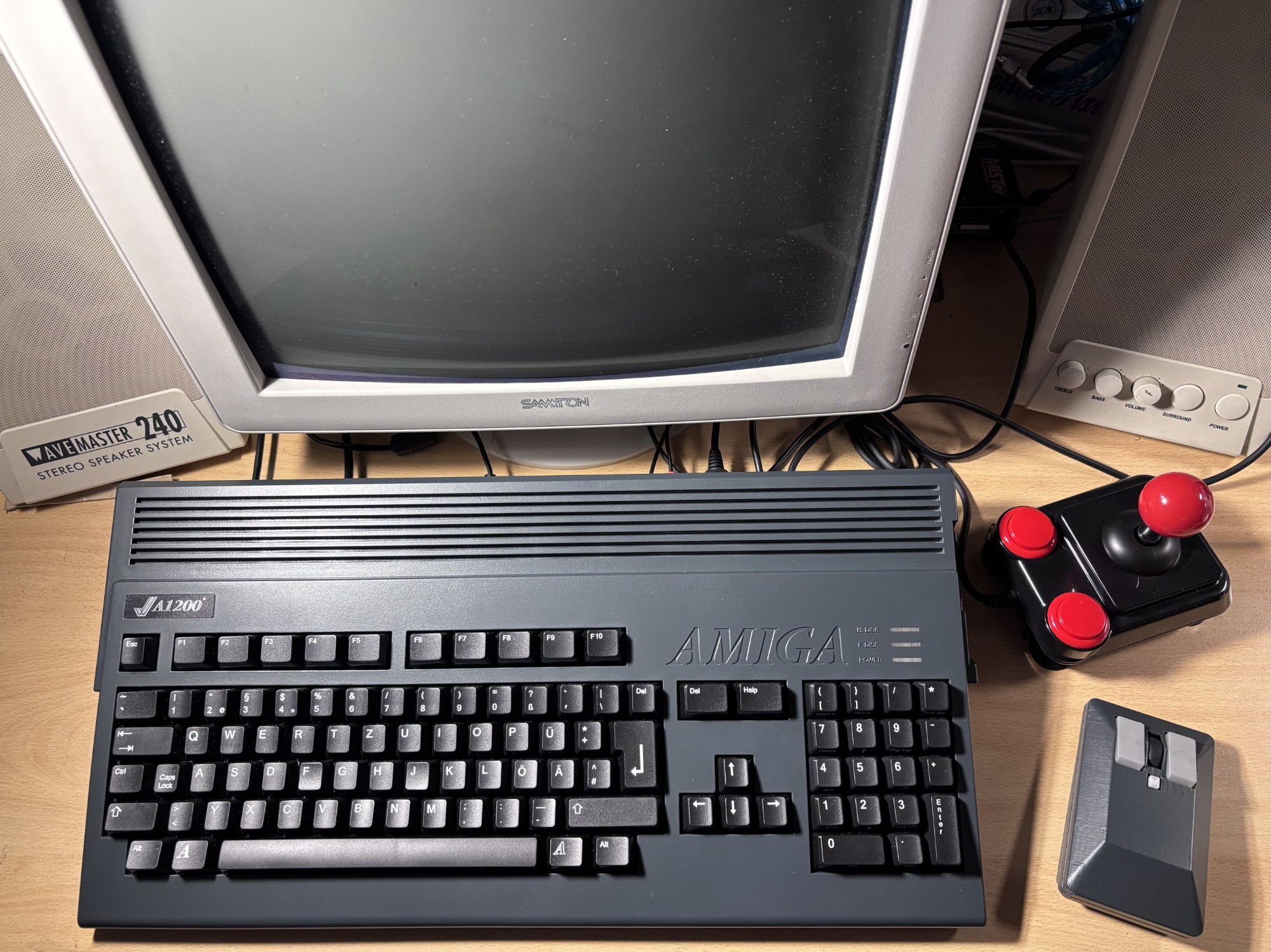 Eigentlich ein sehr schönes Gehäuse aus der späten Amiga-Zeit unter ESCOM. Da aber eh kein Amiga 1200 mehr drin war, habe ich mir überlegt, das Gehäuse weiter zu modifizieren. Also eine dunkle Tastatur eingebaut und das Gehäuse in Anthrazit RAL 9016 lackiert. Dazu habe ich dann noch mit einem Bausatz von Bambu Lab eine drahtlose Tank-Mouse ebenfalls in Anthrazit gemacht.