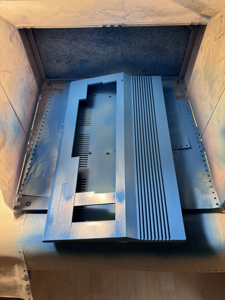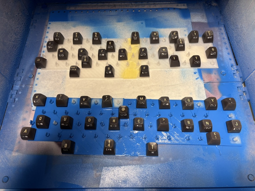 Hier ein paar Bilder vom Fertigungsprozess. Die Lackierung war recht aufwändig, da ich nur transparente Grundierung für die Tasten hatte. So musste ich relativ viele Schichten gelber Farbe aufbringen, um ein gut deckendes Ergebnis zu produzieren. Blau war viel einfacher. Am Ende ist alles mit Klarlack glänzend versiegelt worden. Die Tastaturaufkleber waren gewohnt fummelig anzubringen, aber das Ergebnis überzeugt meiner Meinung nach.